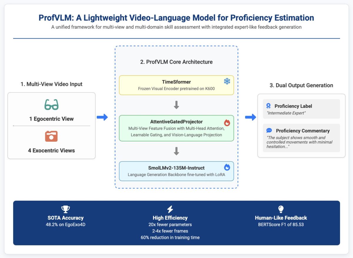 ProfVLM is a lightweight multimodal Vision-Language Model designed to analyze sports performance videos and generate textual proficiency feedback. The system leverages a frozen TimeSformer video encoder and a LoRA-injected SmolLMv2 language model to efficiently process video-text pairs. Trained on EgoExo4D with expert commentaries, ProfVLM surpasses state-of-the-art methods while using up to 20x fewer parameters and reducing training time by up to 60%.