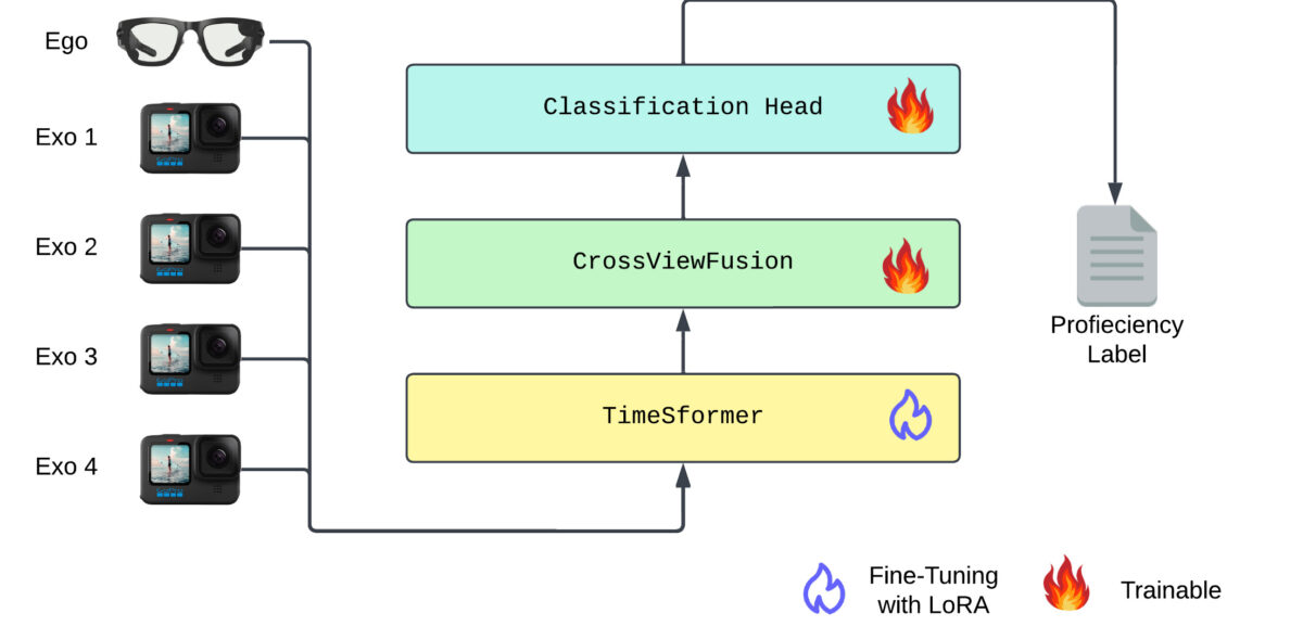 SkillFormer is a parameter-efficient transformer for unified multi-view proficiency estimation. Leveraging the TimeSformer backbone enhanced with our novel CrossViewFusion module, it fuses egocentric and exocentric video features using multi-head cross-attention and adaptive gating. Through Low-Rank Adaptation (LoRA), SkillFormer achieves SOTA performance on EgoExo4D while training with 4.5× fewer parameters and 3.75× fewer epochs—making robust skill assessment accessible for real-world deployment.